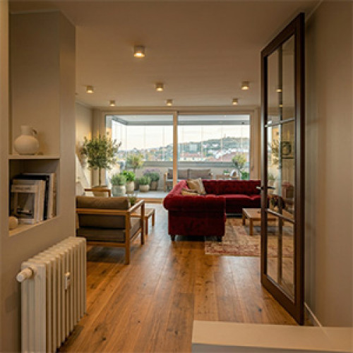 Poslední fotografie je důkazem, že precizní práce se vyplácí. Z prázdného a zdevastovaného prostoru se stala architektonická chlouba. Tento dokončený interiér chodby je ukázkovým příkladem dokonalého sladění prvků. Obrovským trendem jsou oblé stěny obložené dřevěnými akustickými lamelami, které chodbě dodávají exkluzivní, hotelový vzhled a skvěle korespondují s teplým odstínem podlahy.